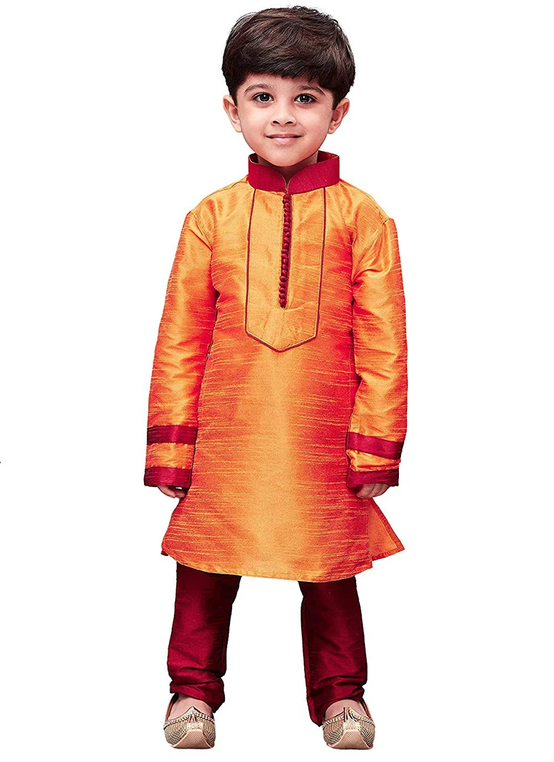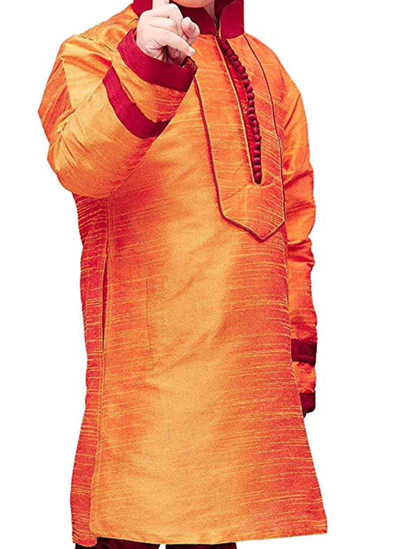 Orange art dupion silk kurta pyjama with elegant solid patterns on the kurta.Comes with matching maroon bottom.