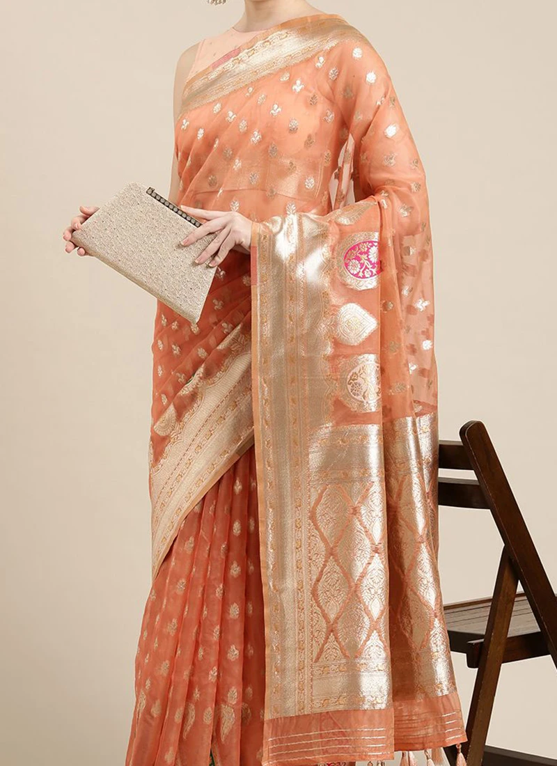 Peach Color Saree With Fabric Of Organza Sari Weaving Designer Work Festive Wear