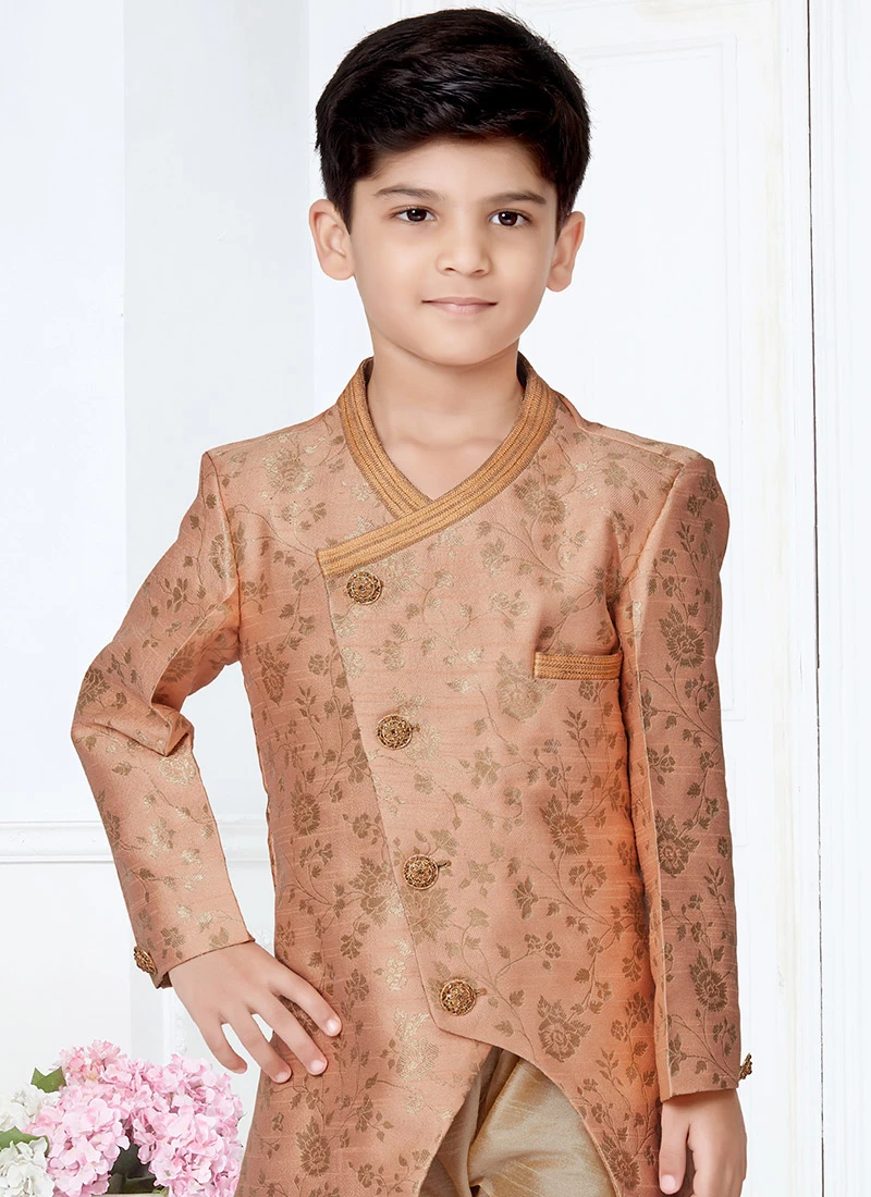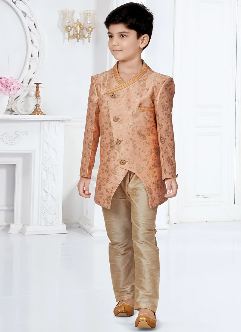 Add style to your boy towards the appearance in this peach silk indowestern sherwani. Beautified with Jacquard work with this sherwani with all the trend and design. This sherwani comes with gold silk dupion chudi pant bottom.