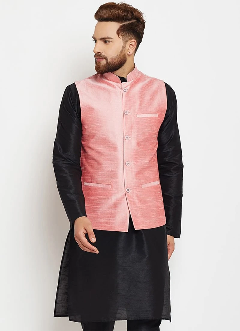 Be your own style icon in this pink dupion silk Nehru Jacket. This attire is encrafted with solid stitched work with pockets.