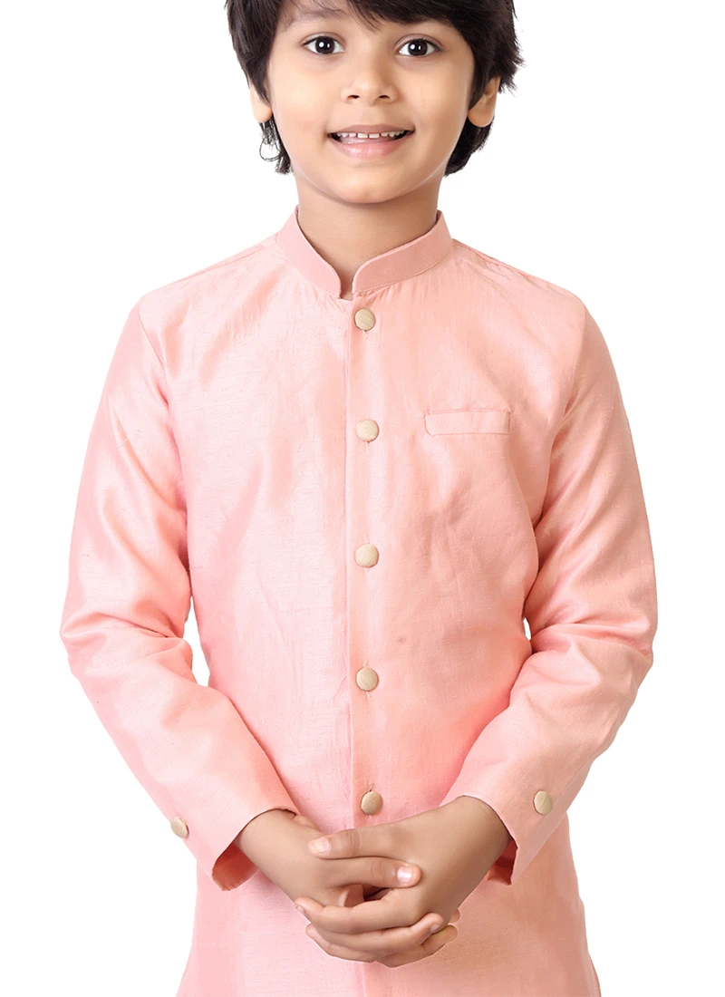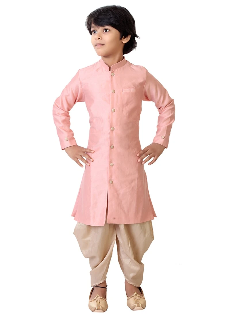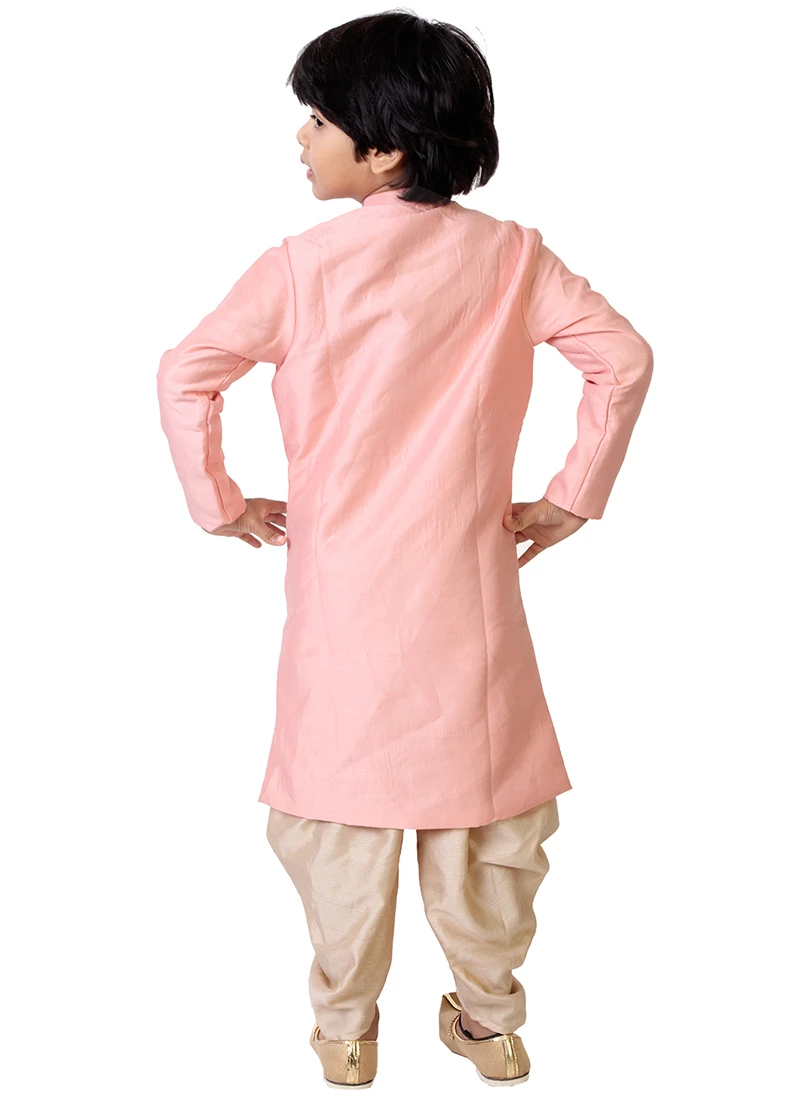Presenting pink art silk sherwani with beige dhoti pants, features Chinese collar, full sleeves, comes with front opening, below knee-length sherwani, slit on both the side start from hip level,shoulder-pad added, paired up with beige dhoti pant with the drawstring closure. Mask only for shoot purposes.Refer the fabric image for true color of the dress. This dress is custom designed from fabric and custom stitched. Once sold cannot be returned.Designs, colors, and patterns on the actual product may slightly vary from designs shown in the image. Images are the only representative