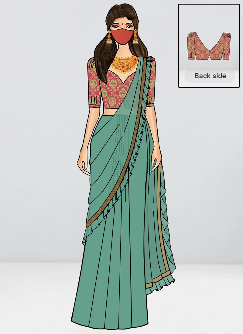 Presenting a pink art silk blouse and turquoise green georgette ruffled saree, features pink art silk blouse, low wide square sweetheart neckline in front and low wide v neck in back with a triangle cut shape, puff elbow sleeves with natural waist length. comes with side zip closure, It is paired up with a green georgette saree with ruffles georgette detailing and golden trim on the pallu and pallu edges. Mask only for shoot purpose.Refer the fabric image for true color of the dress. This dress is custom designed from fabric and custom stitched. Once sold cannot be returned.Designs, colors, and patterns on the actual product may slightly vary from designs shown in the image. Images are the only representative