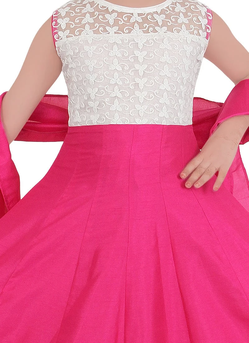 Pink and white art silk teens anarkali suit with embroidered floral patterns on yoke. Comes with matching bottom and dupatta.