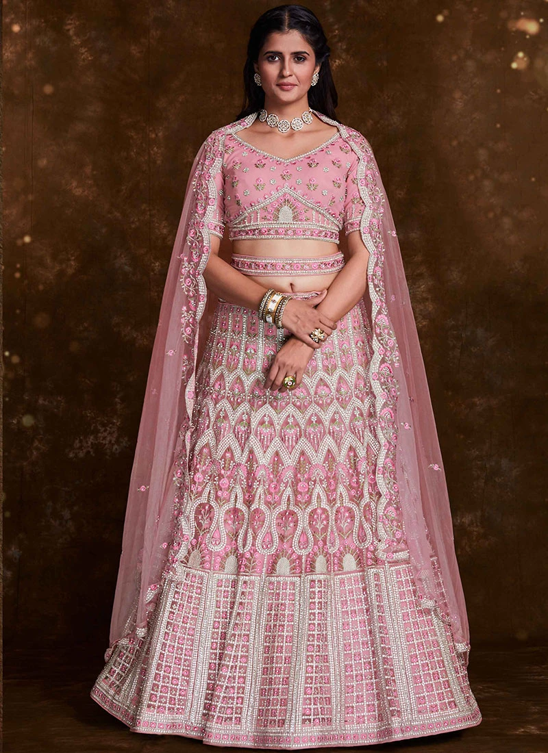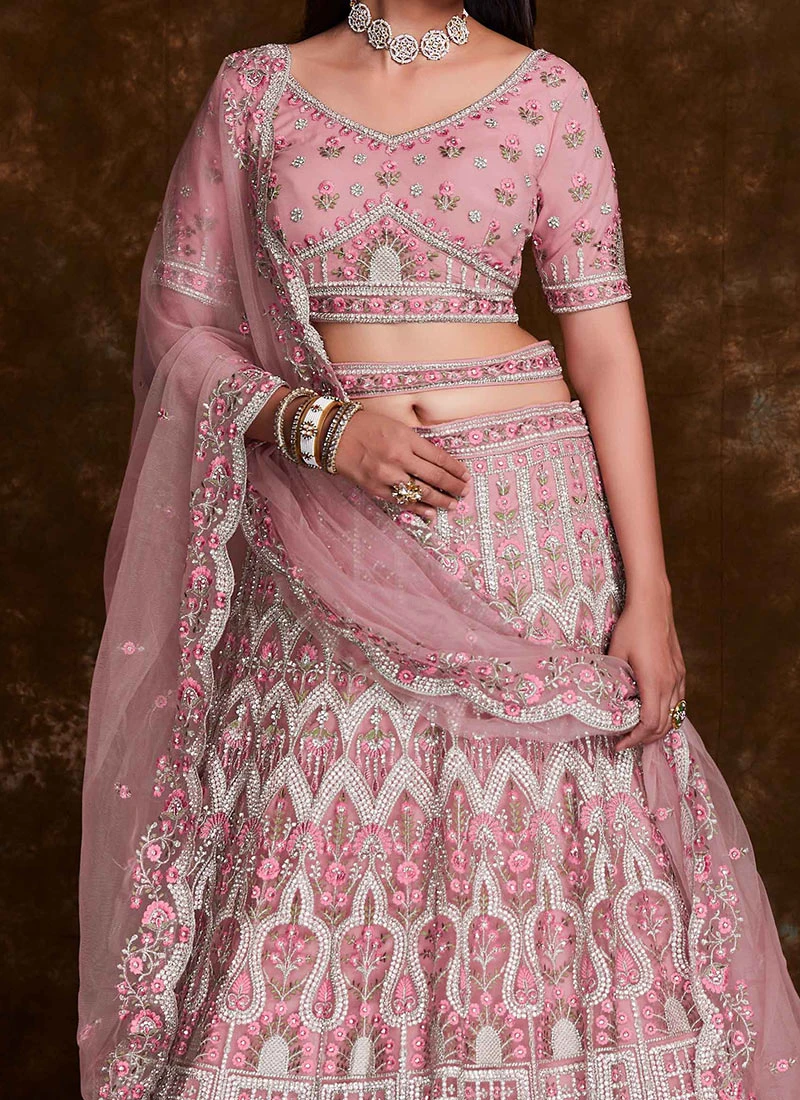 The silhouette of the lehenga is inspired by the classic umbrella style which is characterized by its flared and voluminous skirt. This design choice not only adds drama to the outfit but also allows for ease of movement making it comfortable for dancing and socializing. The skirt features multiple layers of net fabric that create a dreamy and ethereal look as you twirl and move.The lehenga set includes a matching blouse that complements the skirt perfectly. The blouse is also adorned with intricate embroidery that matches the patterns on the skirt creating a harmonious and balanced overall look. The blouse features a classic neckline and short sleeves allowing the focus to remain on the stunning embroidery and the overall silhouette of the lehenga.To complete the ensemble a delicate net dupatta is included. This dupatta features similar embroidery work along its borders and can be draped elegantly over the shoulders or used as a veil adding an extra layer of sophistication to the outfit.This lehenga is perfect for a wide range of special occasions including weddings receptions engagement ceremonies and festive celebrations. Its a versatile outfit that allows you to make a memorable and regal entrance at any event.In summary the Pink Net Embroidered Umbrella Lehenga is a true embodiment of timeless beauty and grace. Its intricate embroidery luxurious fabric and flattering silhouette make it a musthave for any woman looking to make a lasting impression at grand Indian gatherings. This lehenga is not just an outfit its a work of art that celebrates the rich heritage of Indian fashion.