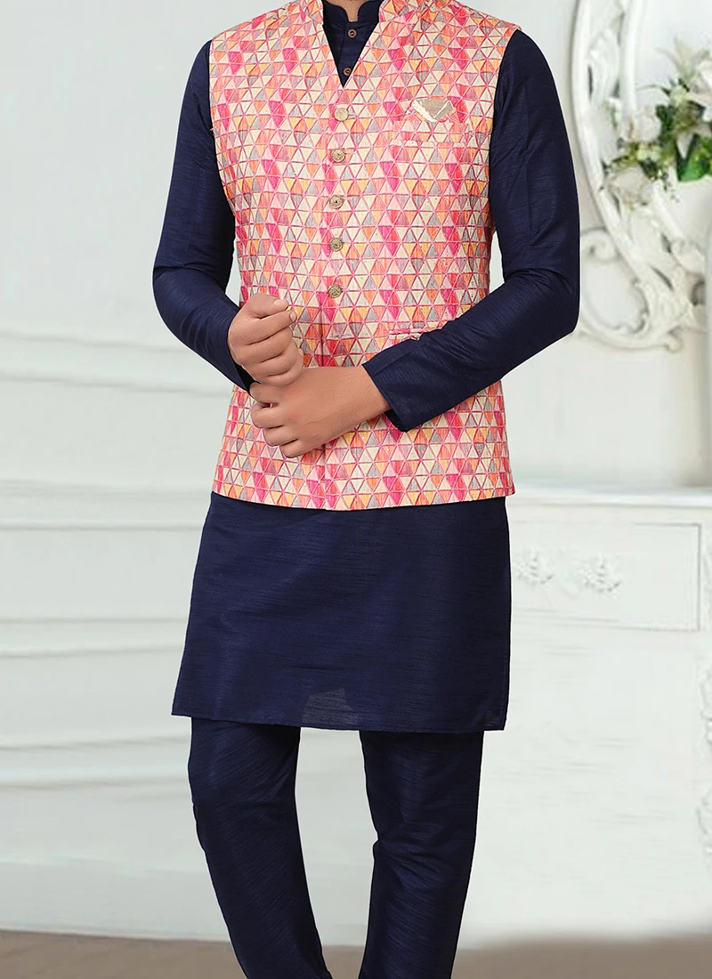 Look amazing with the attachment of pink rayon nehru jacket crafted with mandarin collar neck and sleeveless enriched with digital printed work is representing royalty in itself.