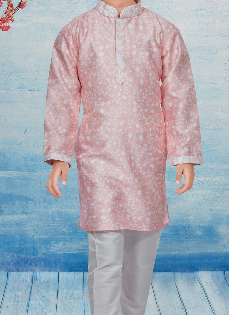 Pink Silk Dupion Printed Kids Kurta Pyjama Party Wear