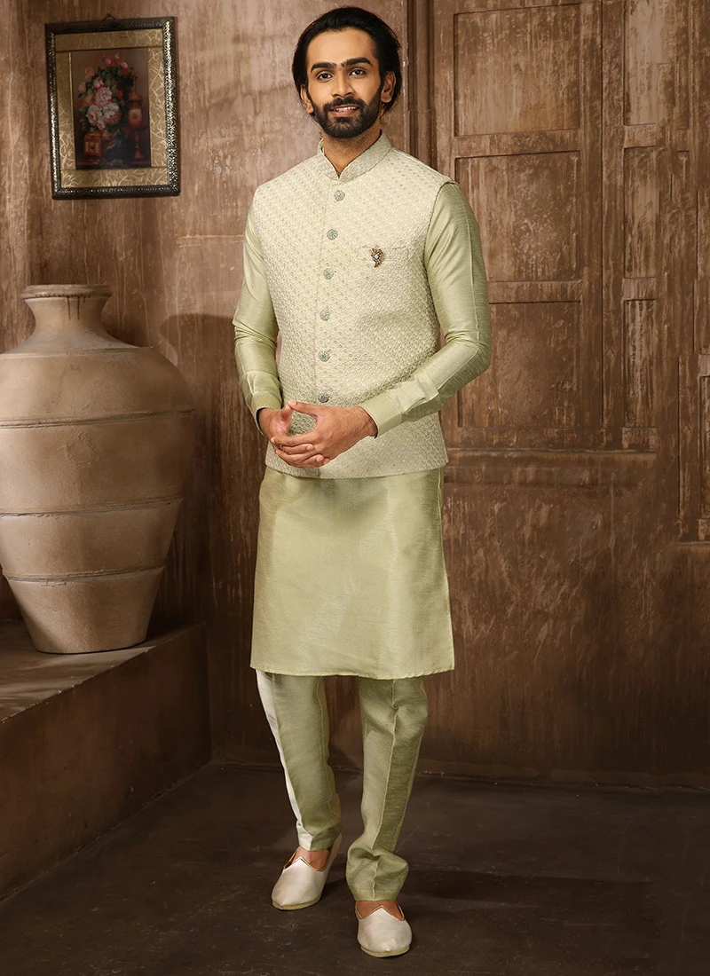 This Pista Green Art Silk Benarasi Bandi Set is a versatile choice suitable for various celebrations weddings and festive occasions. Its classic design and luxurious craftsmanship make it a wardrobe essential for those who appreciate the beauty of traditional Indian attire. Whether worn at weddings cultural events or festive gatherings this ensemble is bound to make a statement capturing the essence of Indian tradition and craftsmanship.