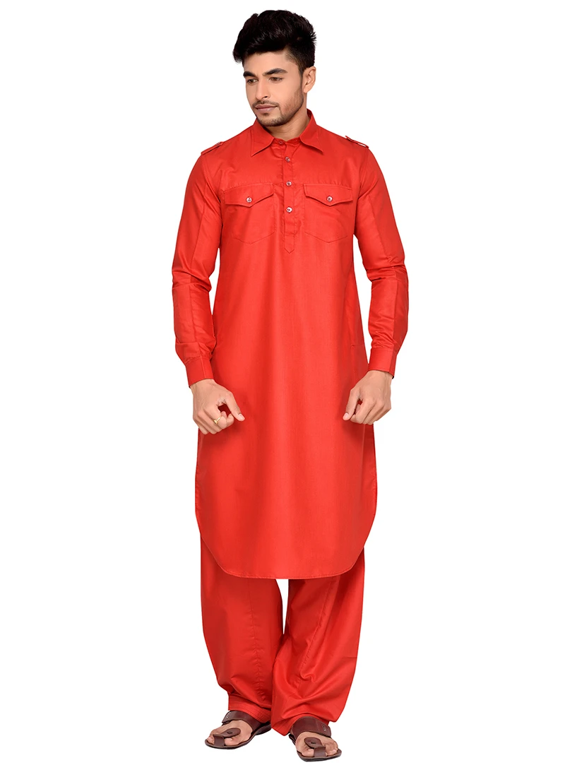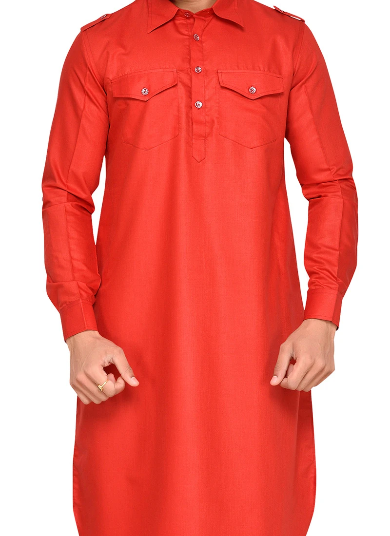 Red art silk plain structred pathani set with side square pockets on it. Comes with matching bottom.