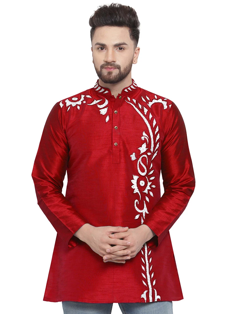 Red dupion silk kurta is fashioned with embroidered work that completes the look.