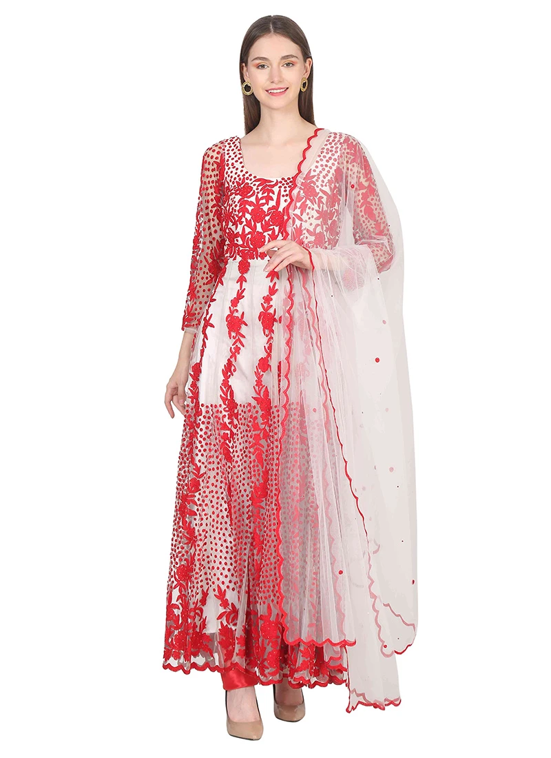 Be an angel and create impact on anyone by carrying this red and white color net anarkali suit. This lovely kameez comes with embroidery and sequins work over the dress looks chic. This suit comes with red shantoon chudi pant bottom and off white color net with lace border dupatta.net with lace border dupatta.