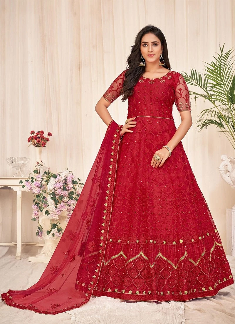 Red Net Embroidered Work Anarkali Suit Party Wear