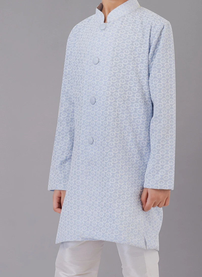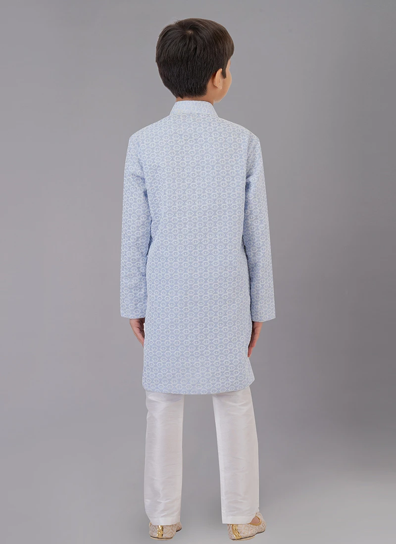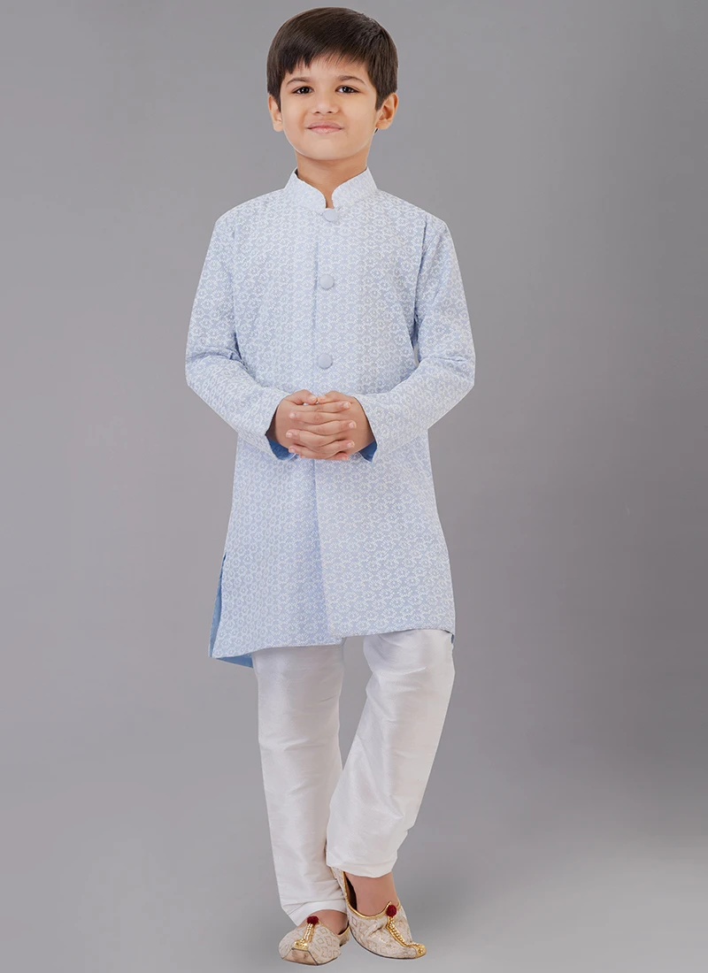 Add grace and charm on your appearance in this sea blue color cotton silk kids boys kurta pyjama enriched with embroidered work over the kurta and crafted with collar neck and full sleeves is representing a royalty in itself. This kurta pyjama comes with white banarasi dupion silk chudi pant bottom.