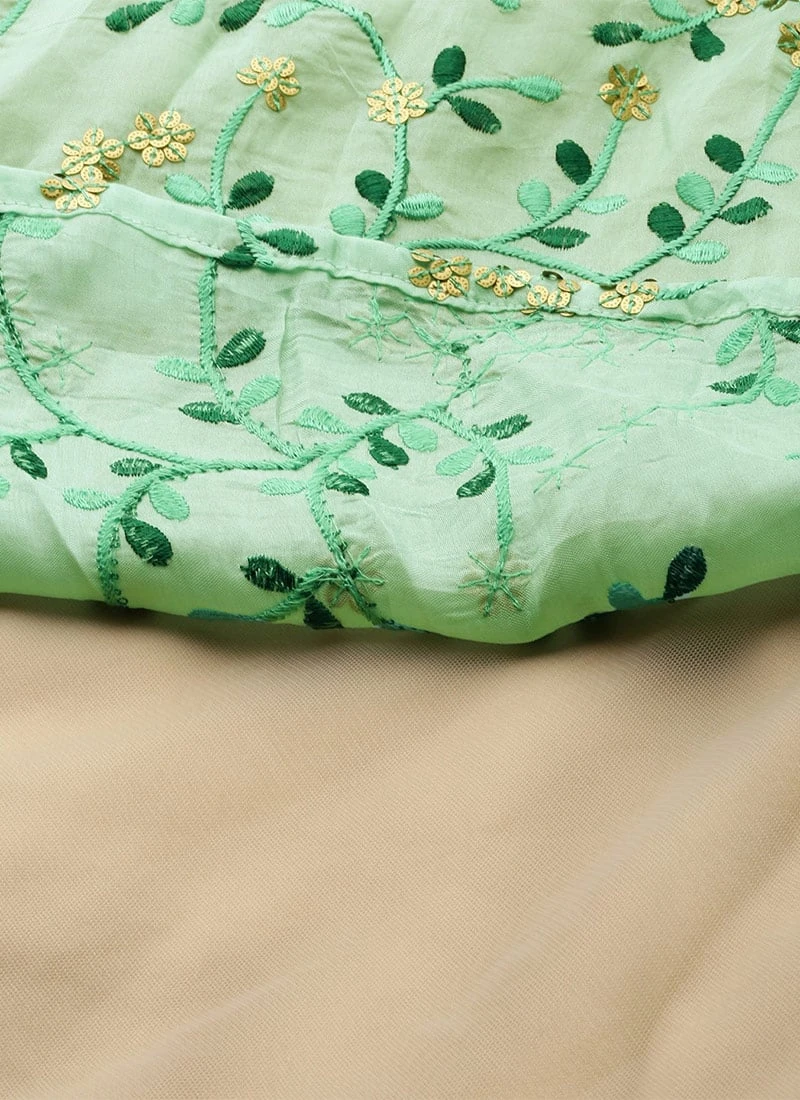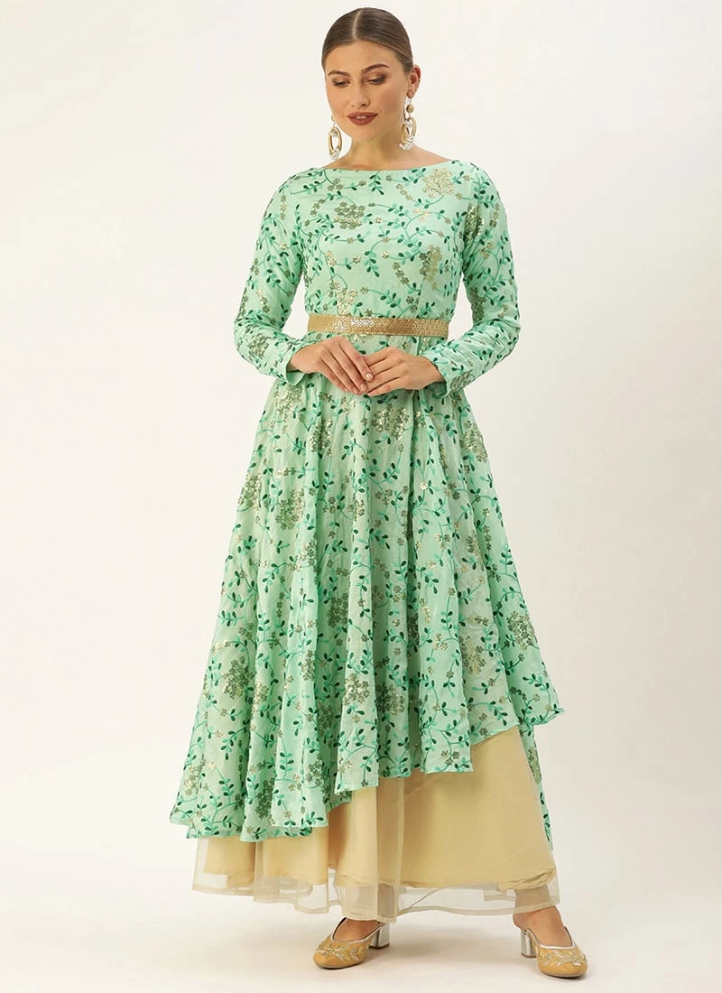 Presenting a sea green embroidered gown, feature with sea green embroidered fabric gown has boat neckline at front and boat neckline with keyhole at back, full sleeve, side zip closure, yoke till natural waist,comes with two layered gown, it has beige net fabric till floor length with minimum flare gown, and sea green fabric as above layer as asymmetrical layer minimum flare gown, highest length till knee length and lowest length till ankle length. Gown has detectable band with embellished trim. Mask only for shoot purposes.Refer the fabric image for true color of the dress. This dress is custom designed from fabric and custom stitched. Once sold cannot be returned.Designs, colors, and patterns on the actual product may slightly vary from designs shown in the image. Images are the only representative