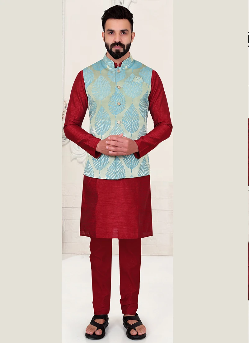 Create a smoldering impact by this sea green silk nehru jacket crafted with mandarin collar neck and sleeveless enriched with different designs is representing royalty in itself.