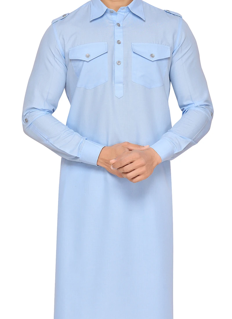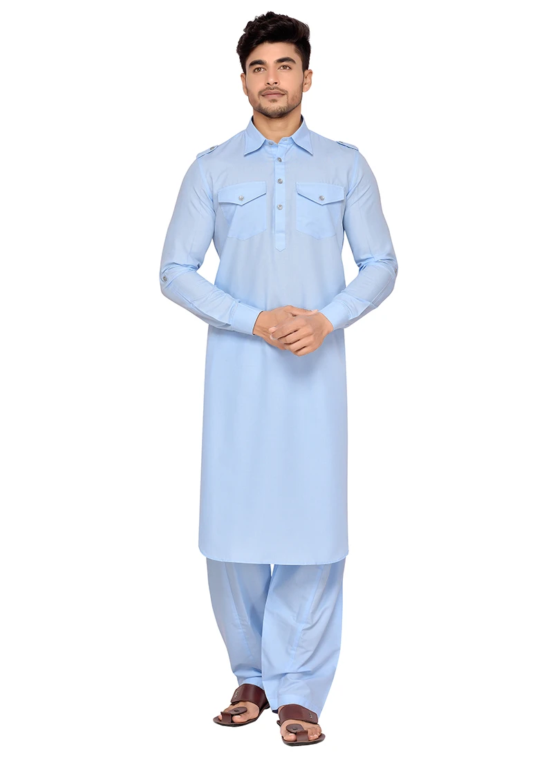 Sky blue art silk plain structred pathani set with side square pockets on it. Comes with matching bottom.