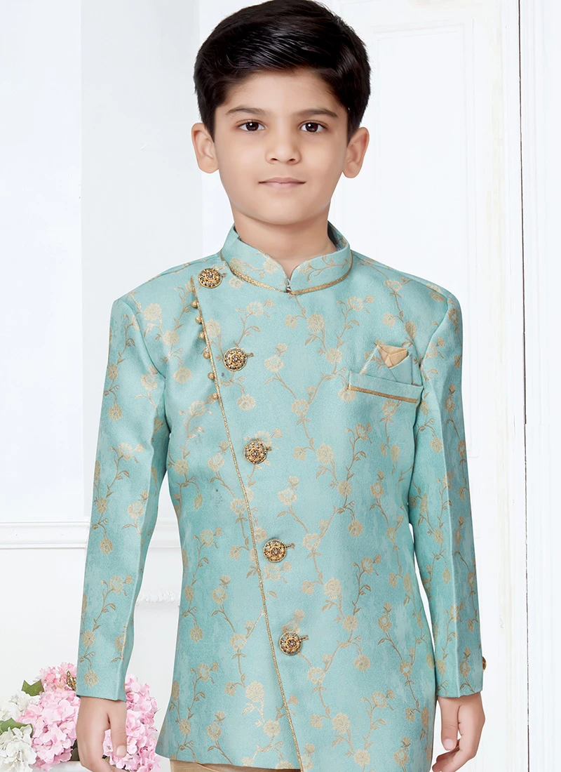 Sky Blue Silk Jacquard Work Indowestern Sherwani Party Wear