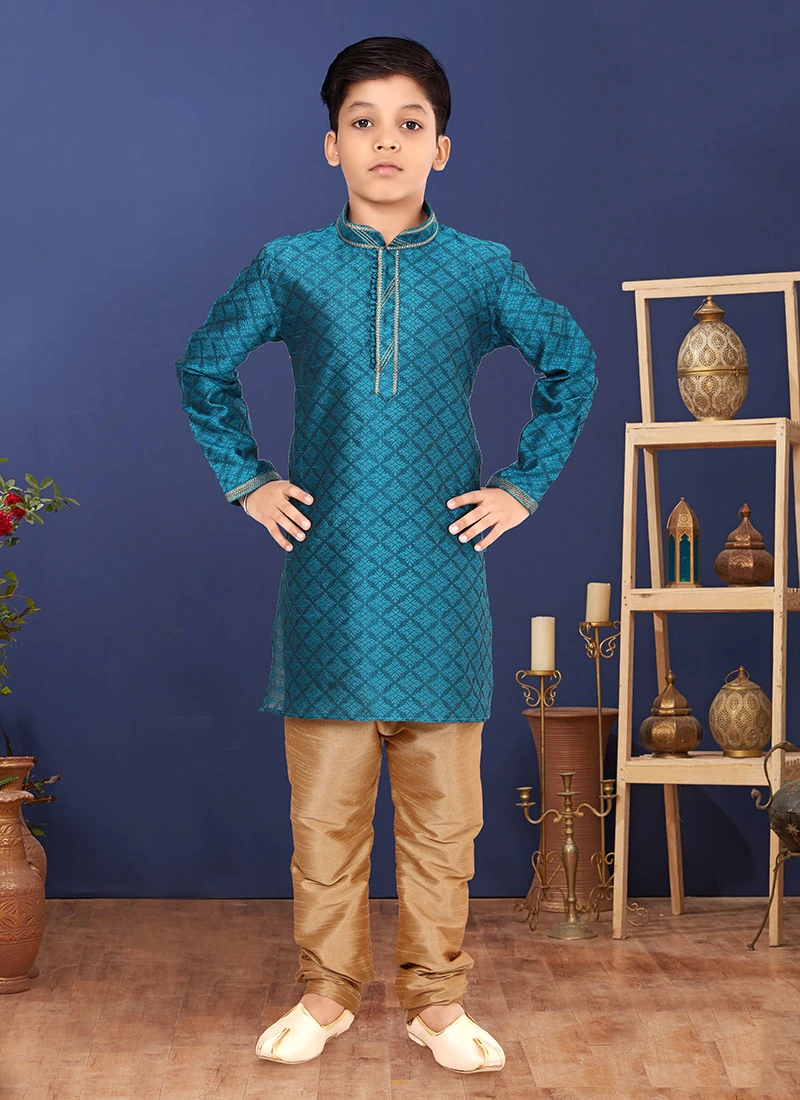 An superb teal blackberry silk boys kurta pyjama enriched with jacquard work crafted with close collar neck and full sleeves is representing a royalty in itself. This kurta pyjama comes with gold dupion silk chudi pant bottom.