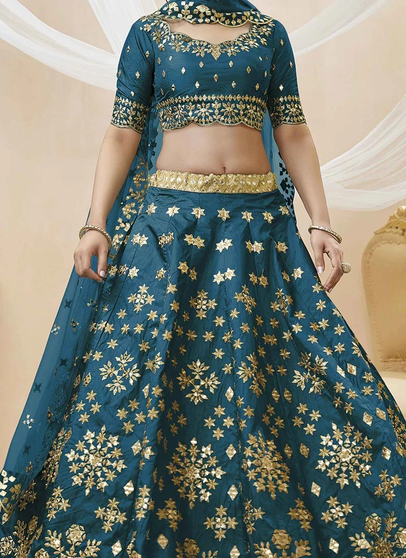 Whether youre a bride looking for a unique wedding attire or a guest attending a special event this Teal Blue Art Silk Zari Mirror Work Umbrella Lehenga is a versatile choice. It strikes the perfect balance between tradition and modernity ensuring that you stand out with grace and sophistication.