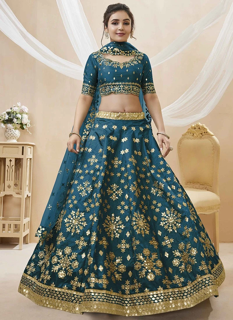 Indulge in the timeless elegance of our exquisite Teal Blue Art Silk Zari Mirror Work Umbrella Lehenga. This resplendent ensemble is a masterpiece of craftsmanship designed to elevate your style quotient and make you the centre of attention at any special occasion.
