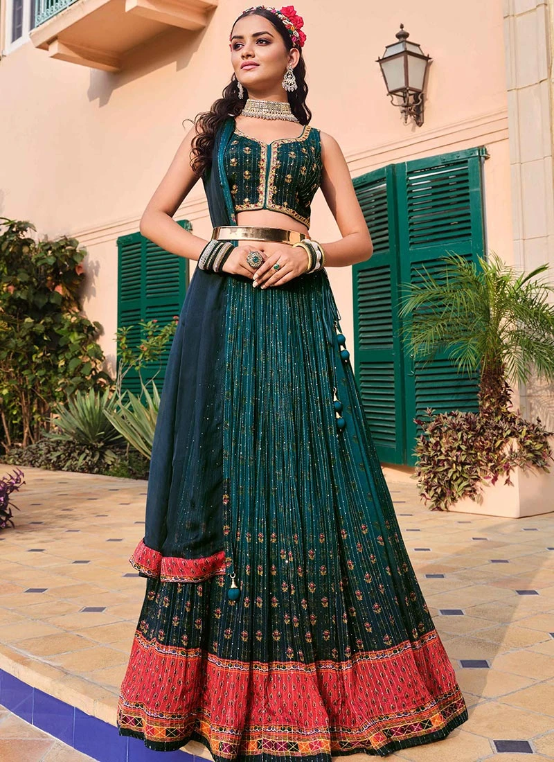 The lehenga features a rich teal green hue adding a touch of sophistication and elegance to the overall look. The use of Chinon fabric enhances the drape and flow of the lehenga ensuring a flattering silhouette that complements various body types. Chinon fabric is known for its lightweight and smooth texture providing comfort and ease of movement for the wearer.