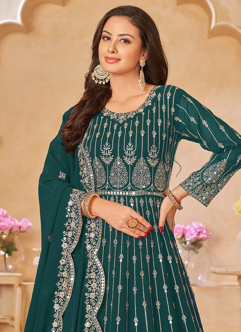 This Teal Green Faux Georgette Embroidered Anarkali Suit is a versatile choice suitable for weddings parties festive gatherings and other special events. It effortlessly combines traditional elements with contemporary aesthetics making it a timeless addition to any womans ethnic wardrobe.