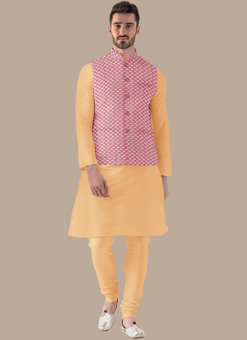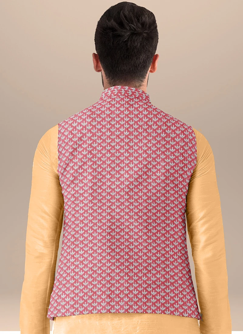 Teen Boys Beige N Pink Embroidered Bandi Set Party Wear