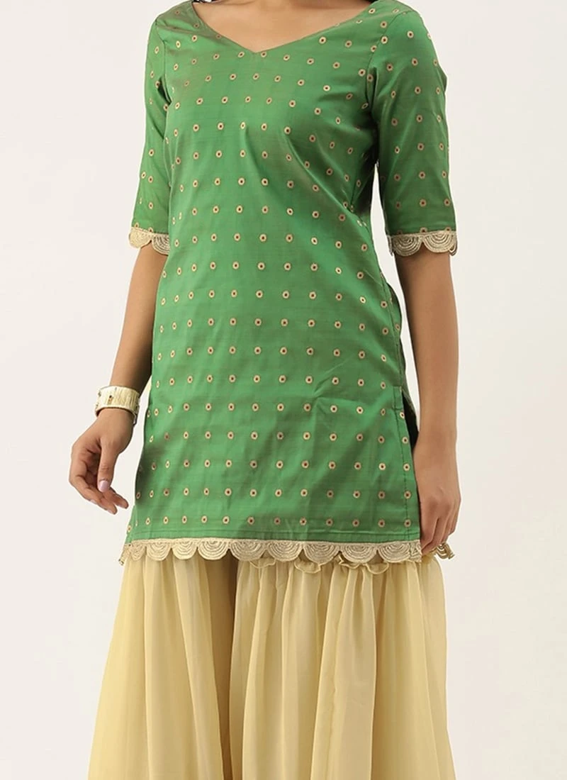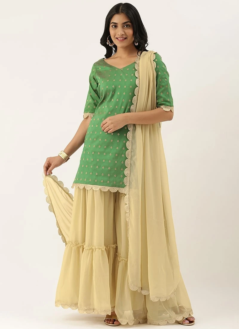 Teen Girls Beige N Green Zari Tiered Sharara Set Festive Wear