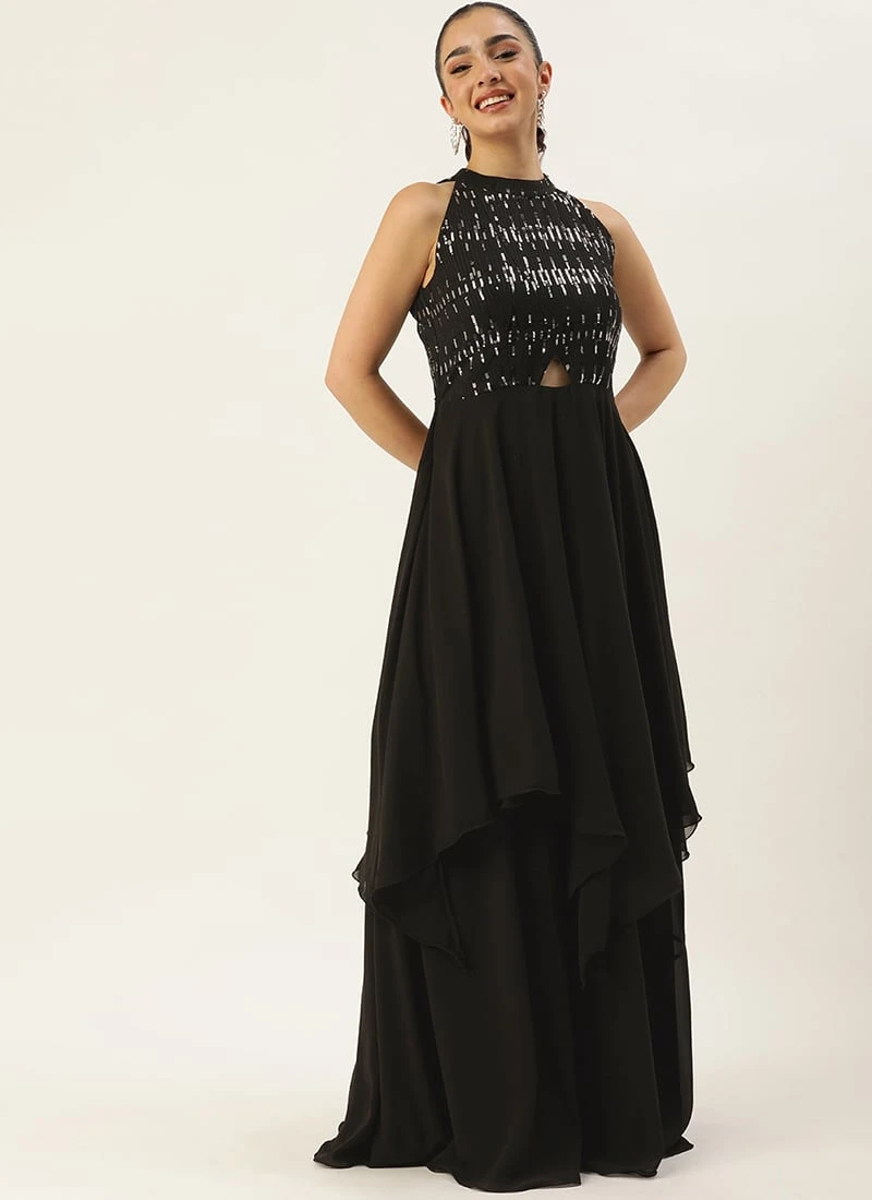 Teen Girls Black Embroidered Halter Neck Gown Festive Wear