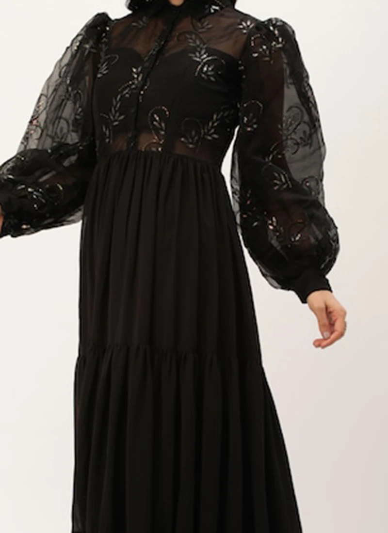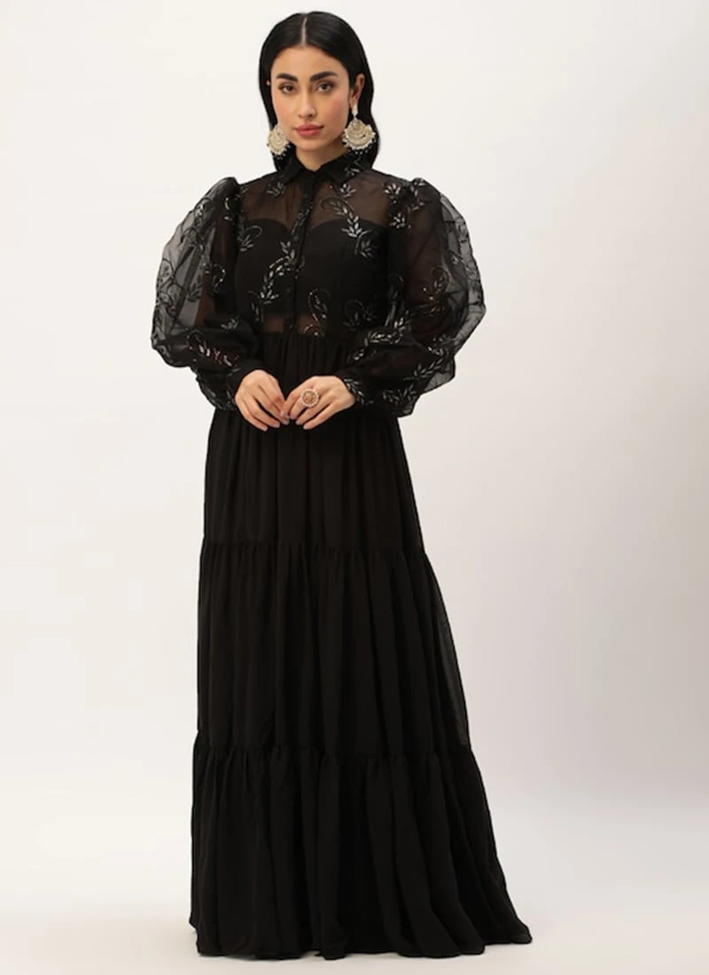 Teen Girls Black Embroidered Organza Tiered Style Wedding Wear