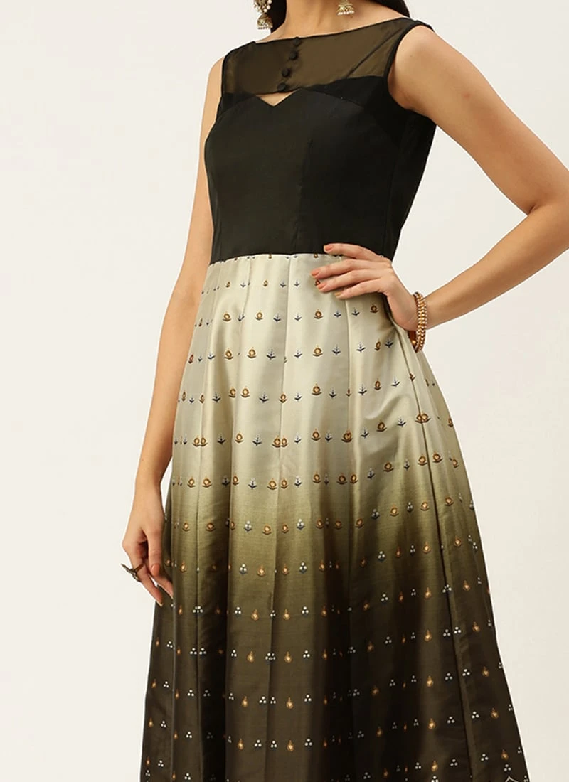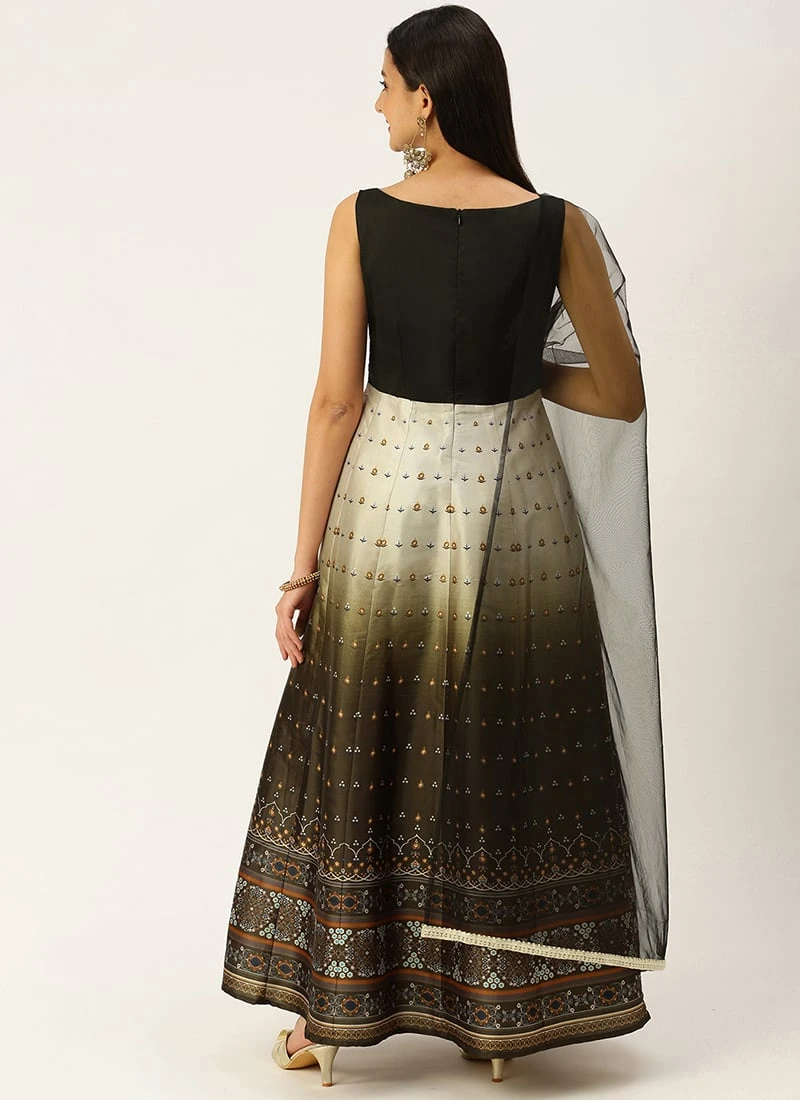 Teen Girls Black N Green Taffeta Printed Anarkali Suit Festive Wear
