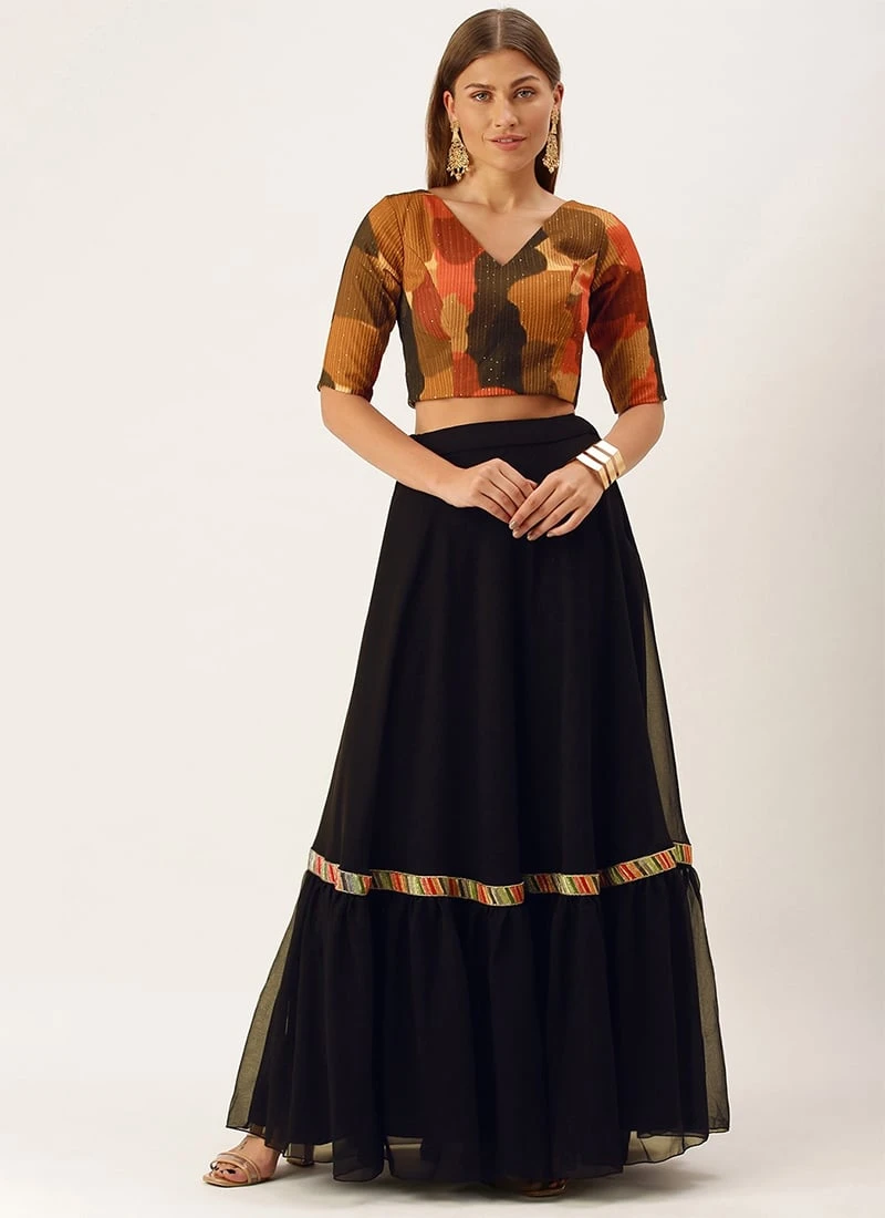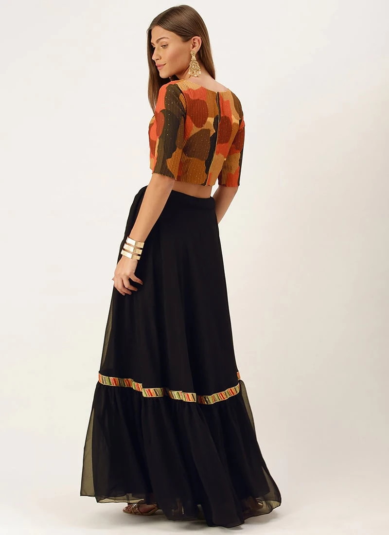 Teen Girls Black N Multicolored Embroidered Crop Top N Skirt Festive Wear