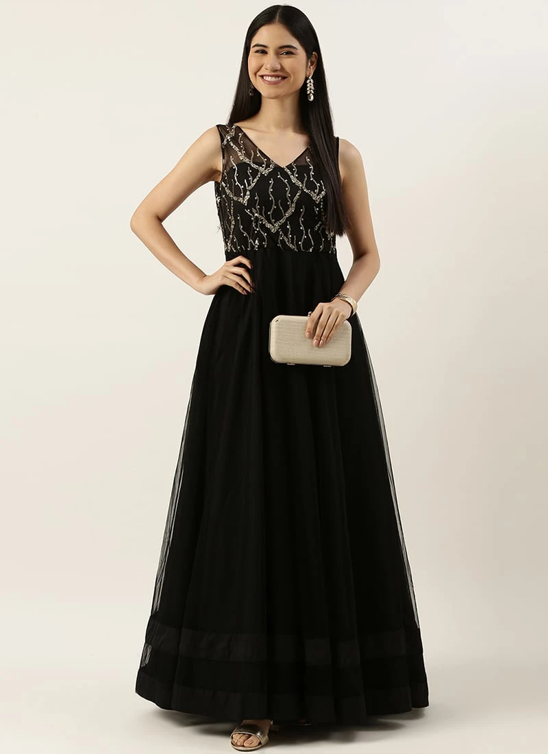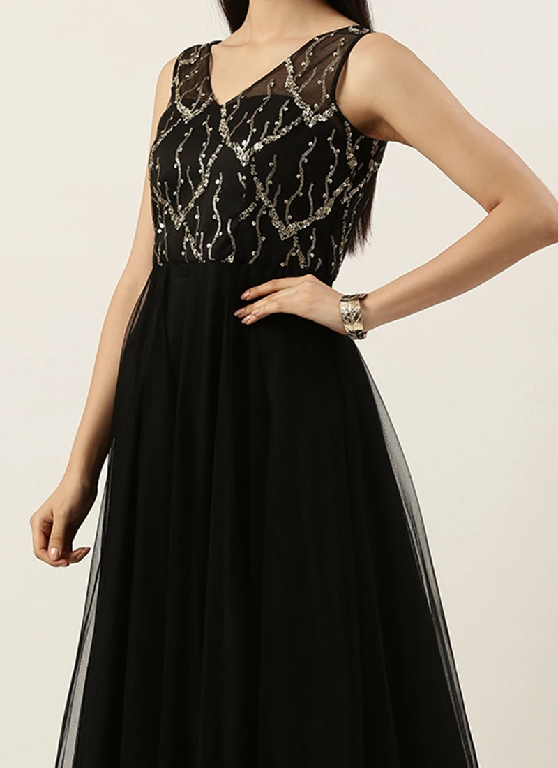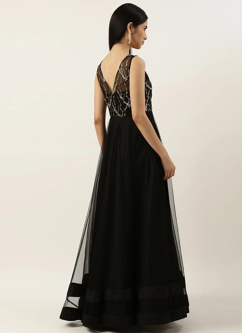 Teen Girls Black Net Sequins Embroidery Party Wear
