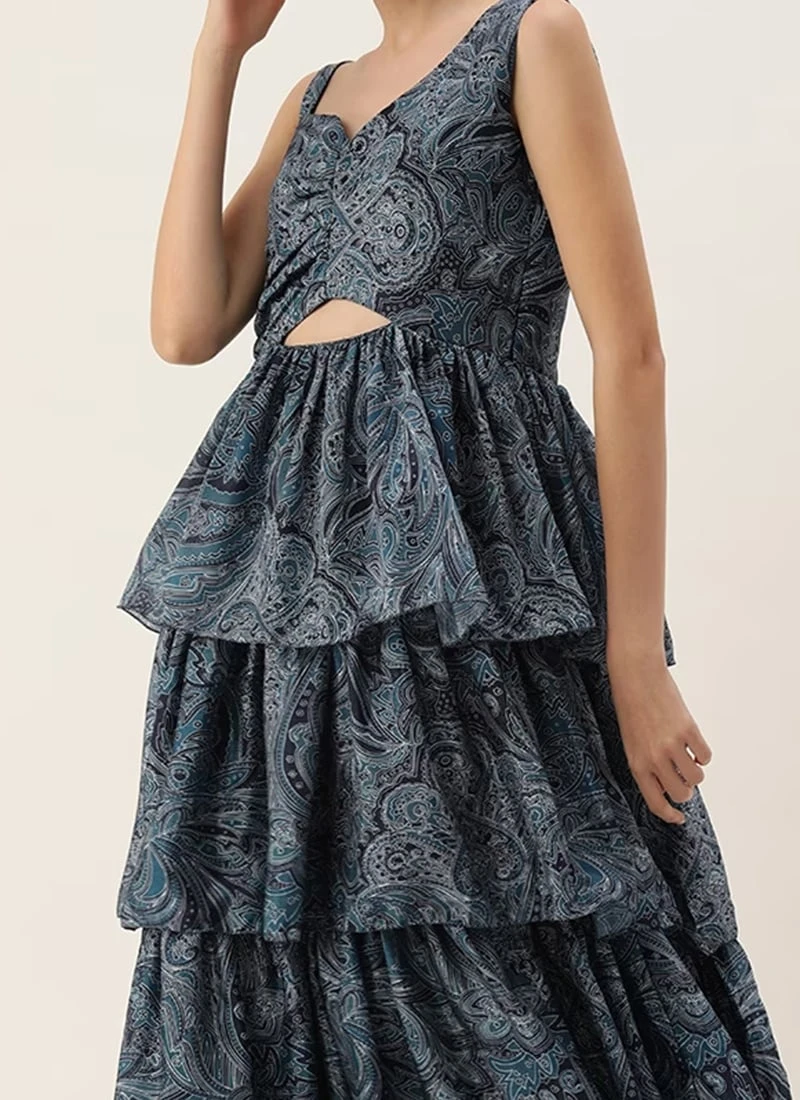 Teen Girls Blue Chinon Digital Printed Layered Gown Party Wear
