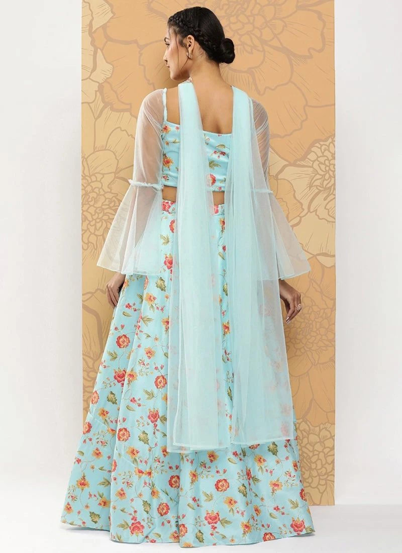 Teen Girls Blue Embroidered Art Silk Bell Sleeves Lehenga Wedding Wear