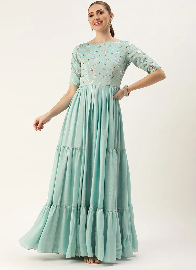 Teen Girls Blue Embroidered Art Silk Tiered Gown Festive Wear