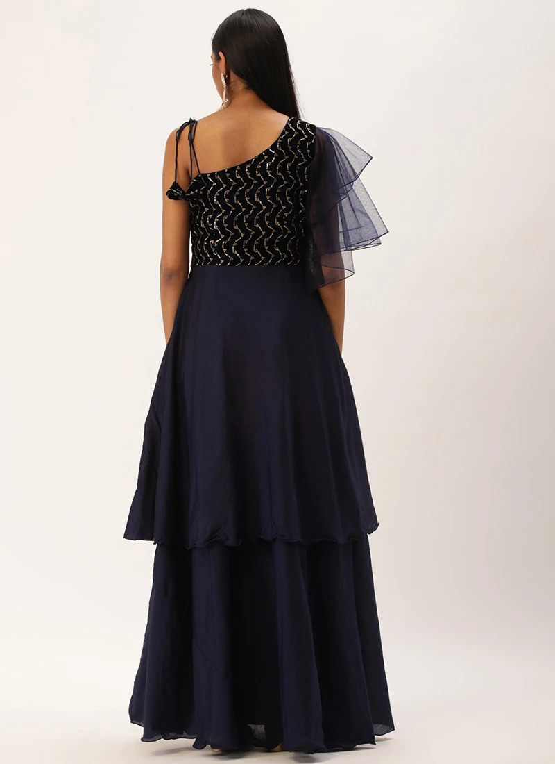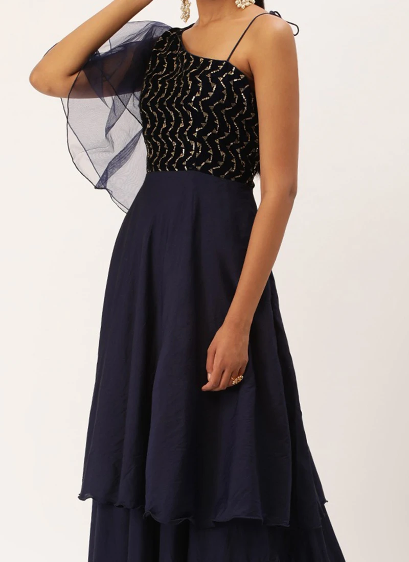 Teen Girls Blue Embroidered Velvet N Art Silk Gown Festive Wear