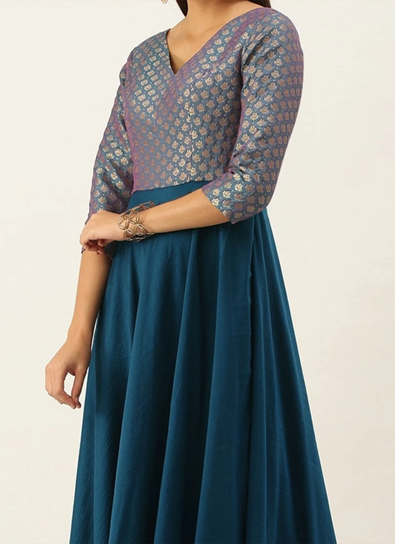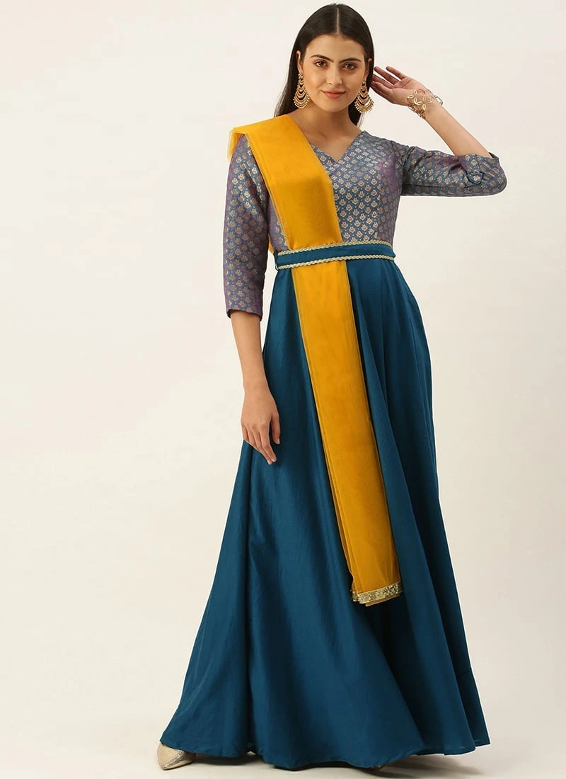 Teen Girls Blue Jacquard N Freesia Yellow Dupatta Style Gown Festive Wear