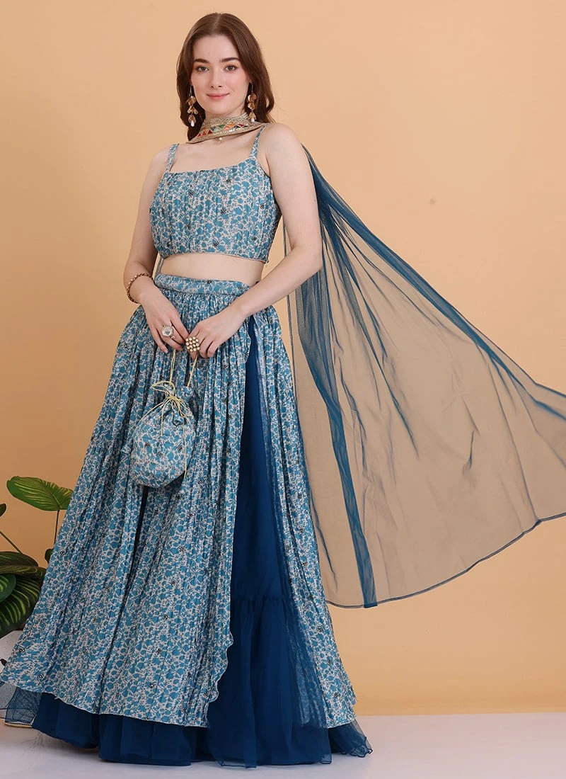 Teen Girls Blue N Cream Chinon Lehenga Set With Potli Bag Festive Wear