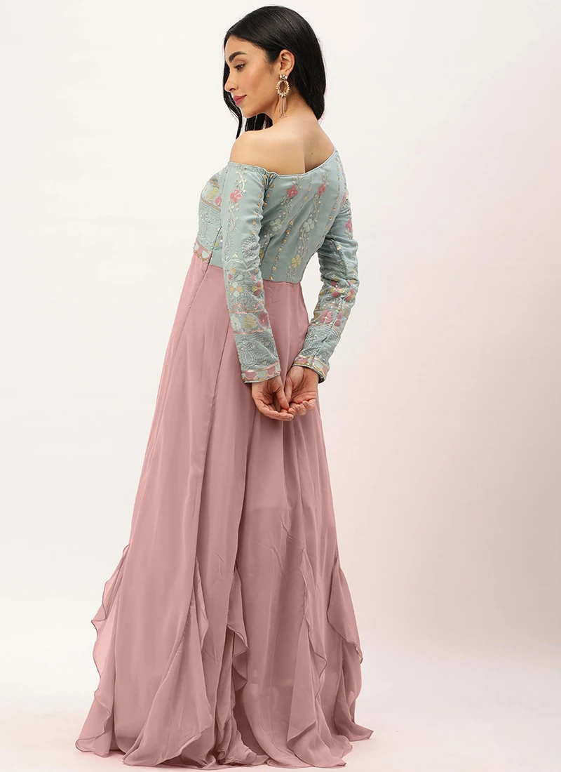 Teen Girls Blue N Pink Embroidered One Shoulder Ruffle Gown Party Wear