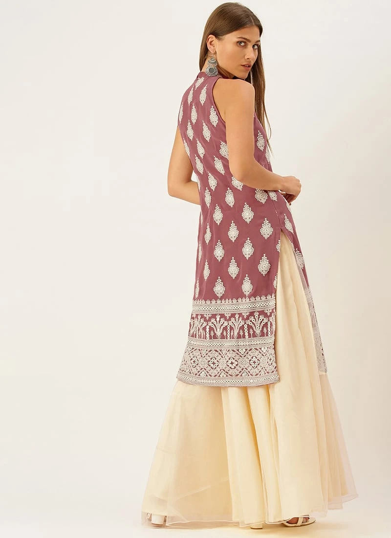 Teen Girls Brown Embroidered N Off White Skirt Set Festive Wear