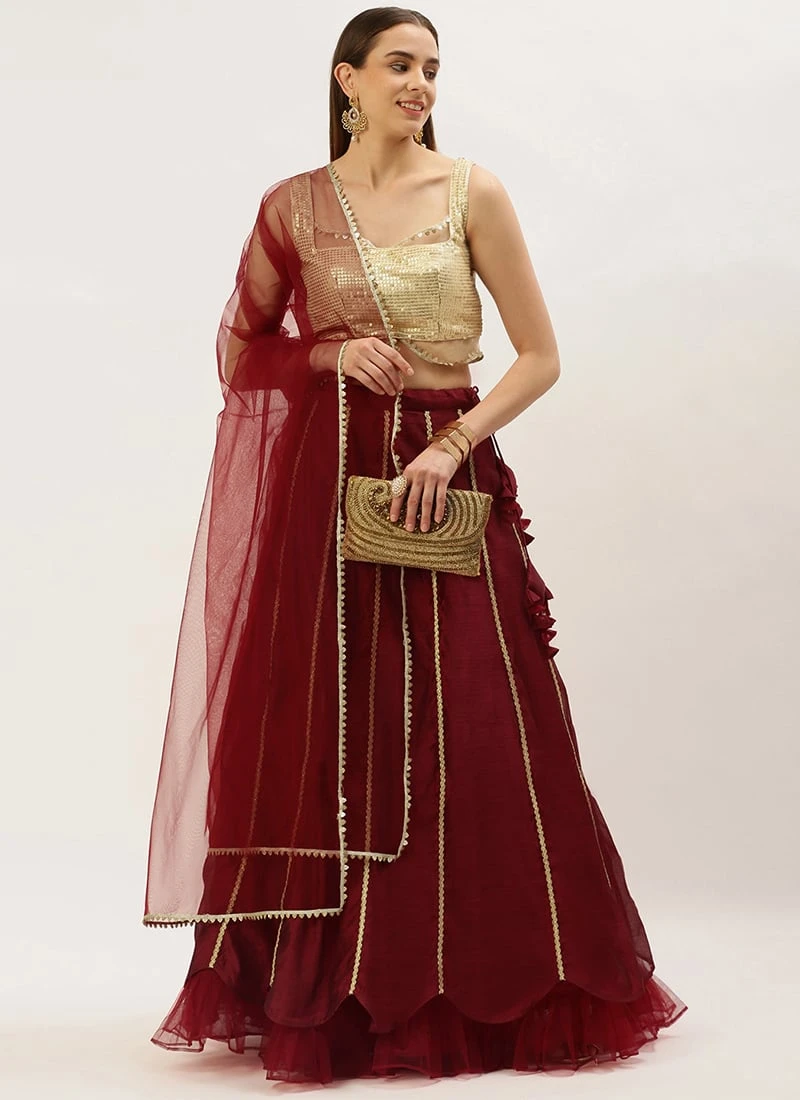 Teen Girls Cream Georgette Embroidered Maroon Kali Lehenga Festive Wear