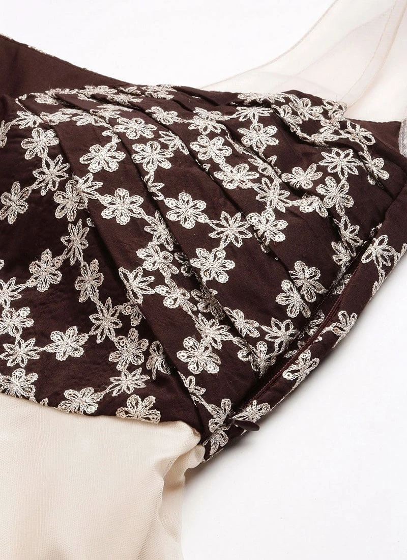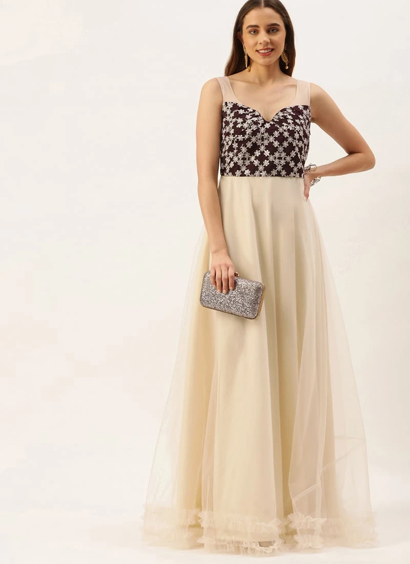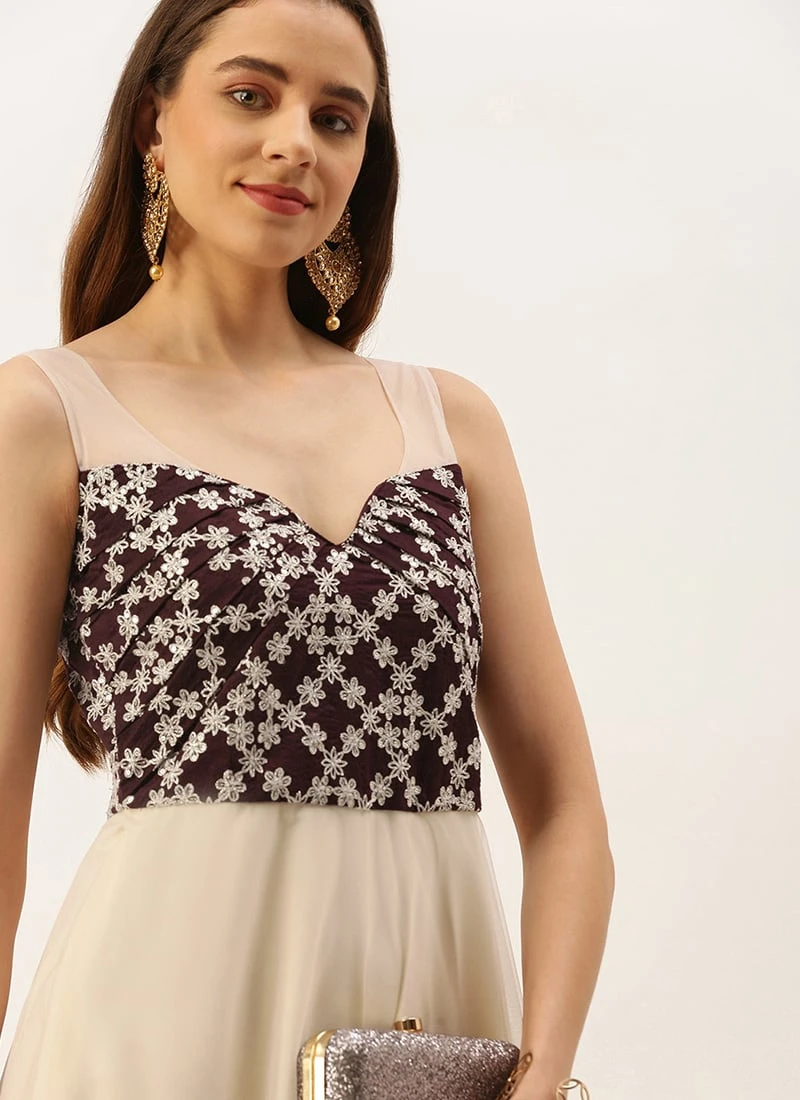 Teen Girls Cream N Wine Muslin Sequins Embroidered Gown Festive Wear