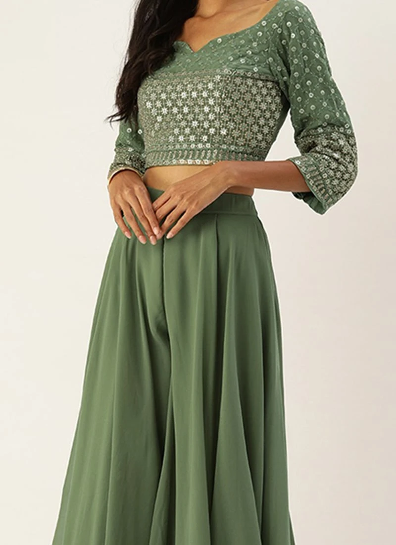 Teen Girls Green Embroidered Georgette Crop Top N Sharara Party Wear
