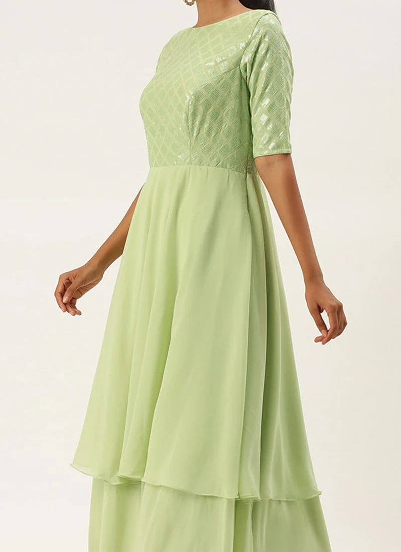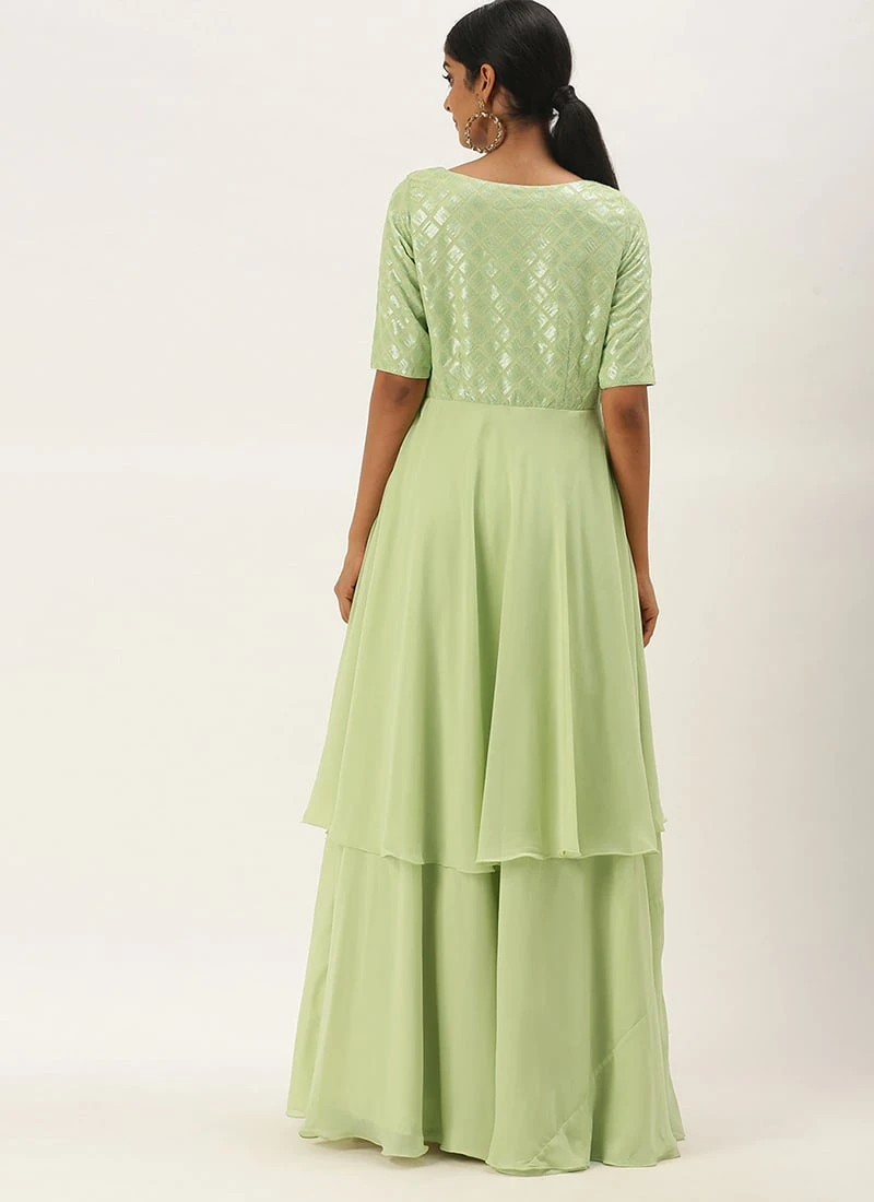 Teen Girls Green Georgette Embroidered Layered Gown Festive Wear