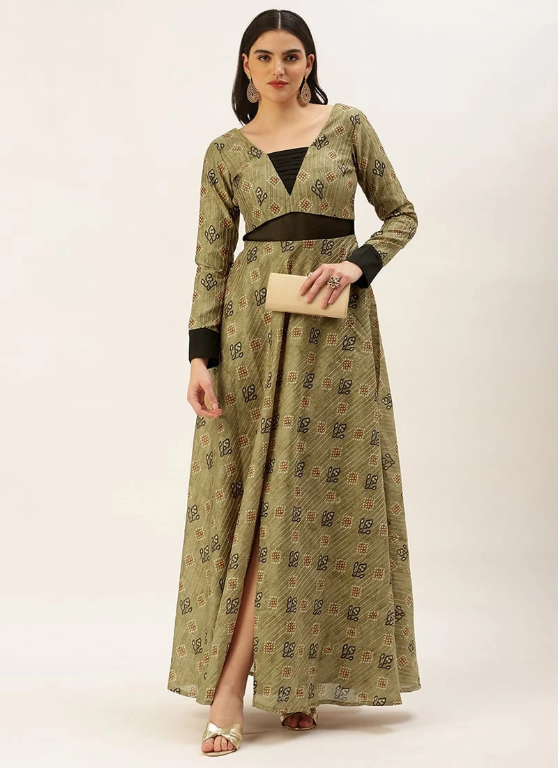 Teen Girls Green Printed Art Silk Cotton Gown Party Wear
