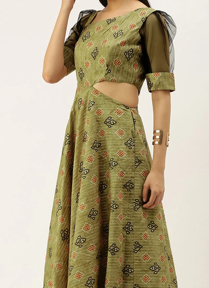 Teen Girls Green Printed Art Silk Gown Festive Wear