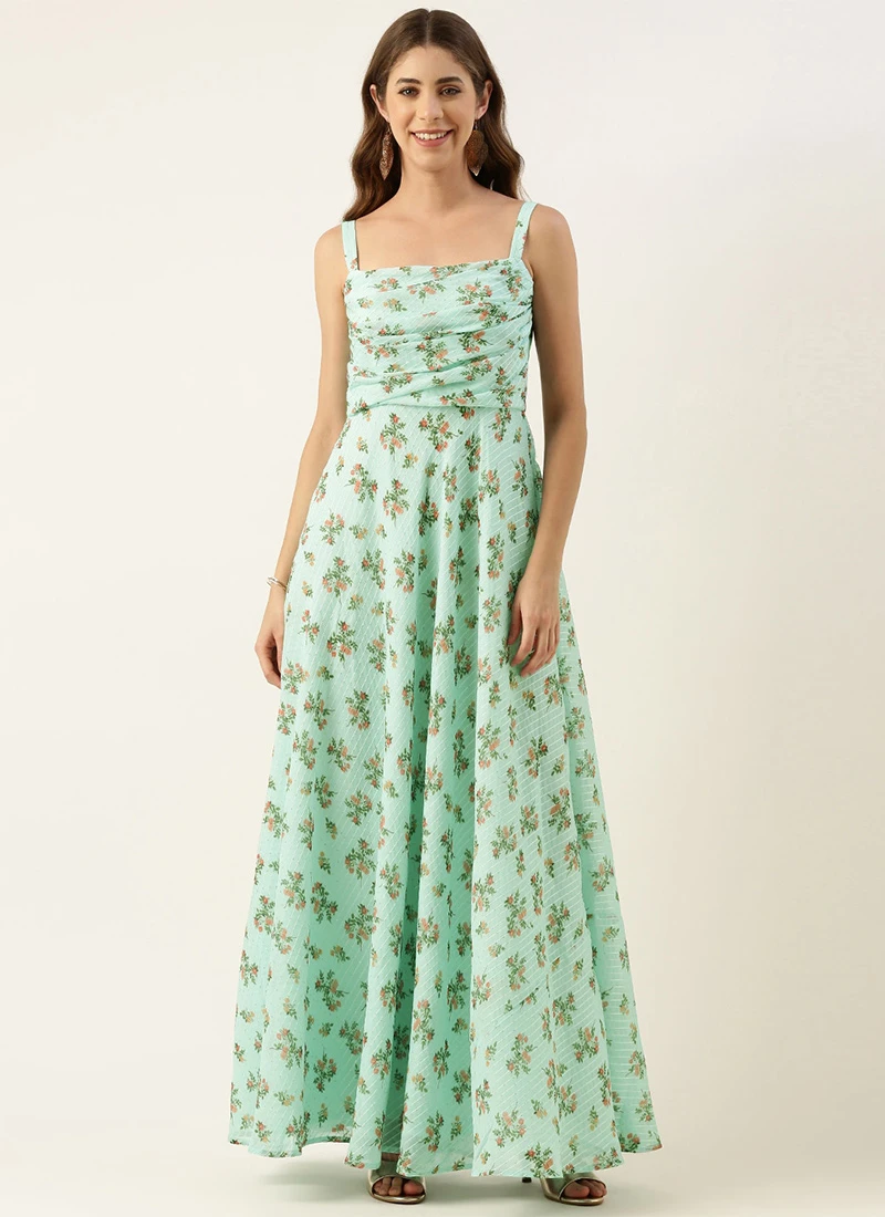 Teen Girls Green Printed N Embroidered Georgette Gown After Six Wear
