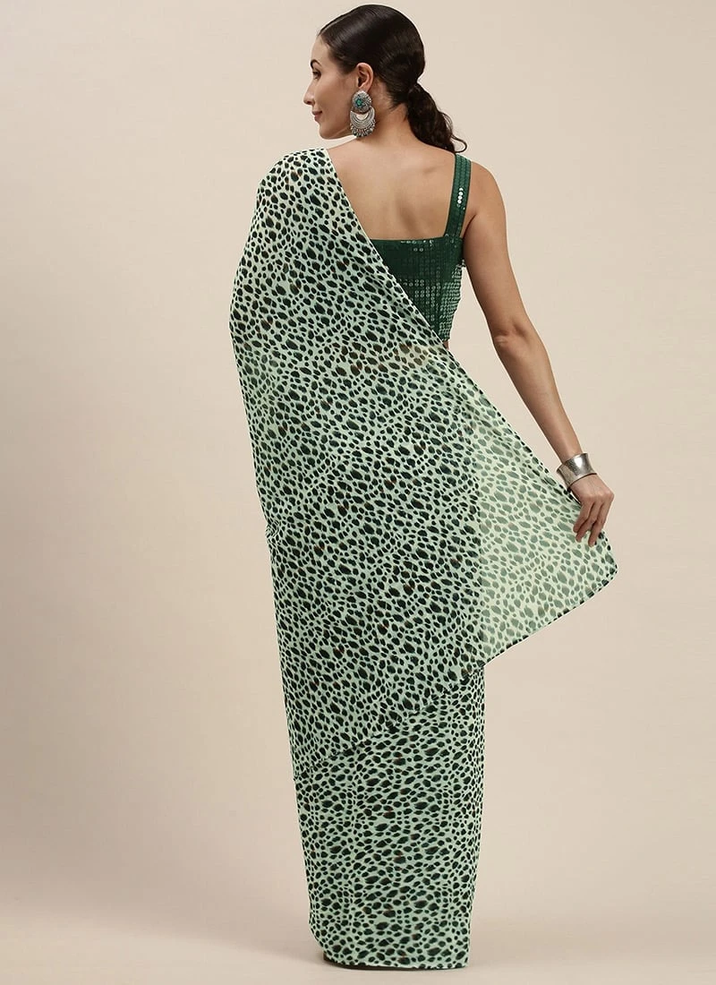 Teen Girls Green Sequins Blouse N Cream Printed Saree Party Wear