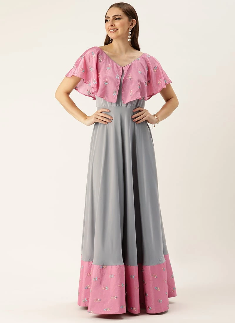 Teen Girls Grey Art Silk N Pink Chinon Zero Shoulder Style Gown Party Wear
