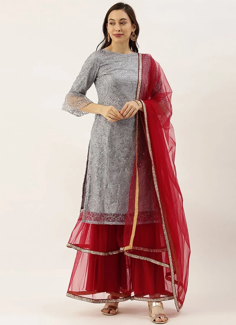 Teen Girls Grey Embroidered N Red Layered Gharara Suit Festive Wear